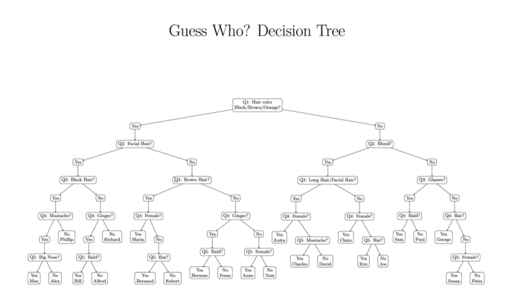 Now we have questions that split characters the best they can like “Does your character have facial hair?” or “Is your character blond?”. We will use “Does your character have facial hair?” and continue this process. We can then arrive at this diagram bellow: