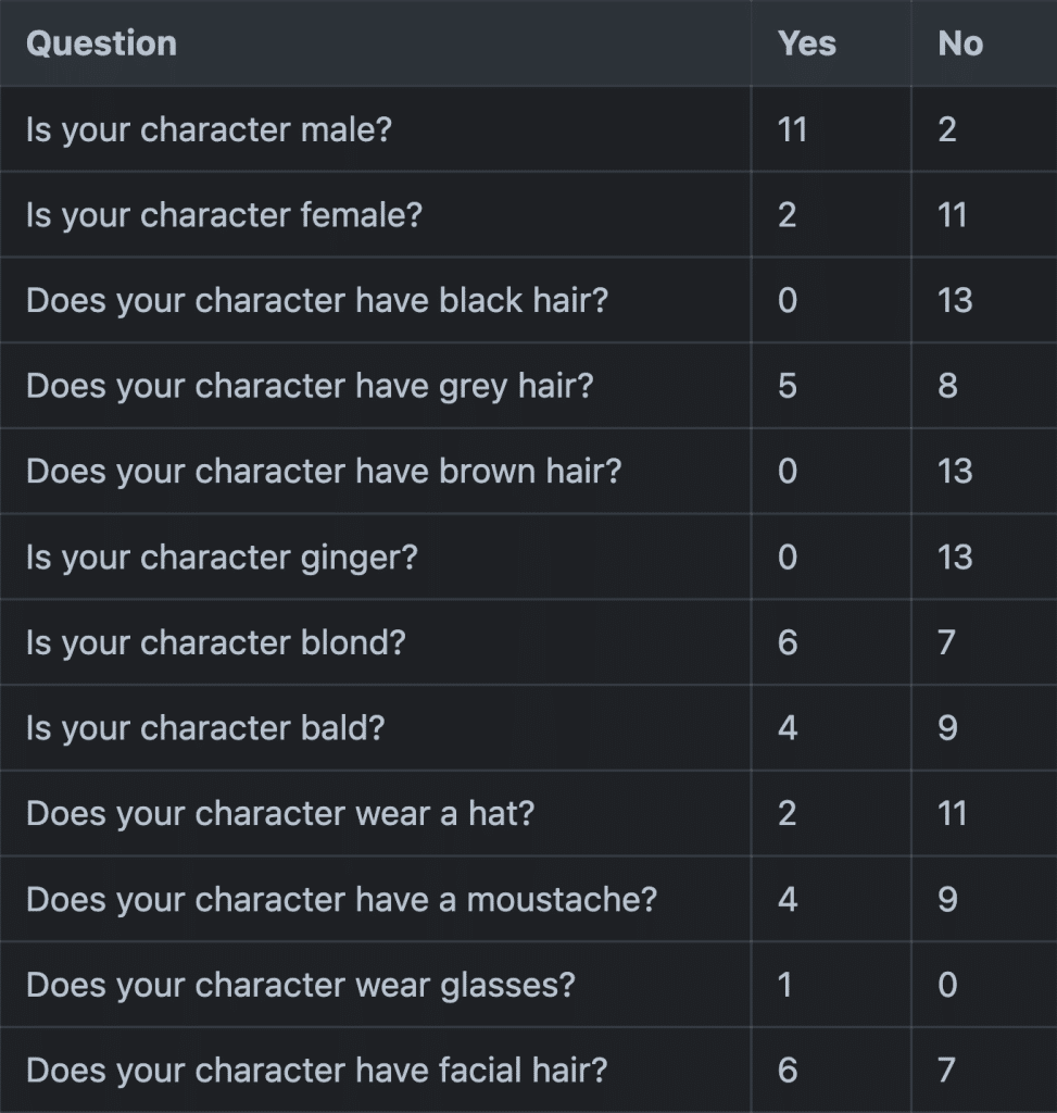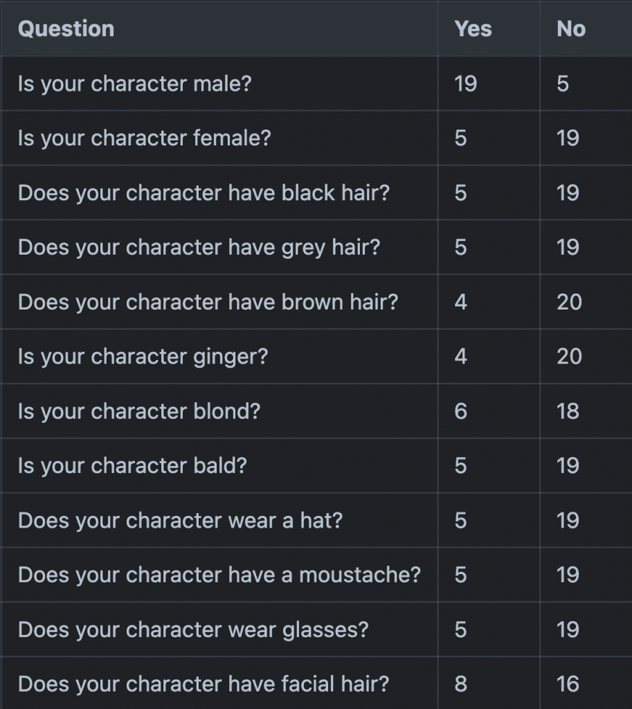 This is much closer to an ideal 50/50 split. We could even create a perfect 12/12 split with a bizarre question like “Does your character have black, brown, or orange hair and is not a female with a hat?”. But that’s essentially the same as the previous one, just moving Maria (the only female with a hat) to the other group.